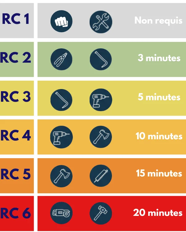 - RC4 / CR4 : Cette classe introduit la véritable catégorie anti-effraction. Évalué face à la hache, aux scies, aux outils de frappe et de sciage.