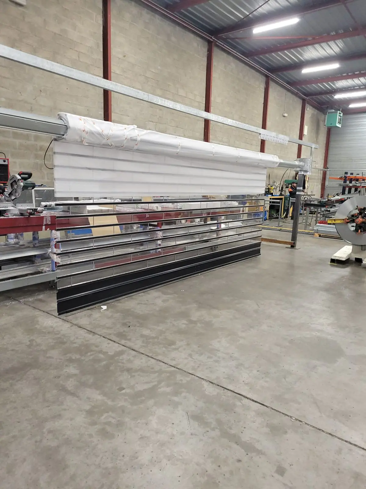 Lames en acier galvanisé, plaques polycarbonate, axe d'enroulement et coulisses sont découpés, assemblés et façonnés dans la journée. Cette "fabrication minute" autorise un stock continu et une réactivité absolue.